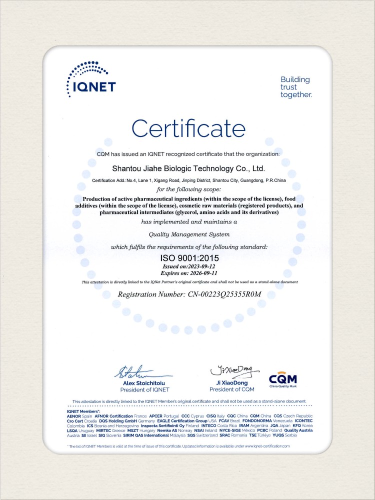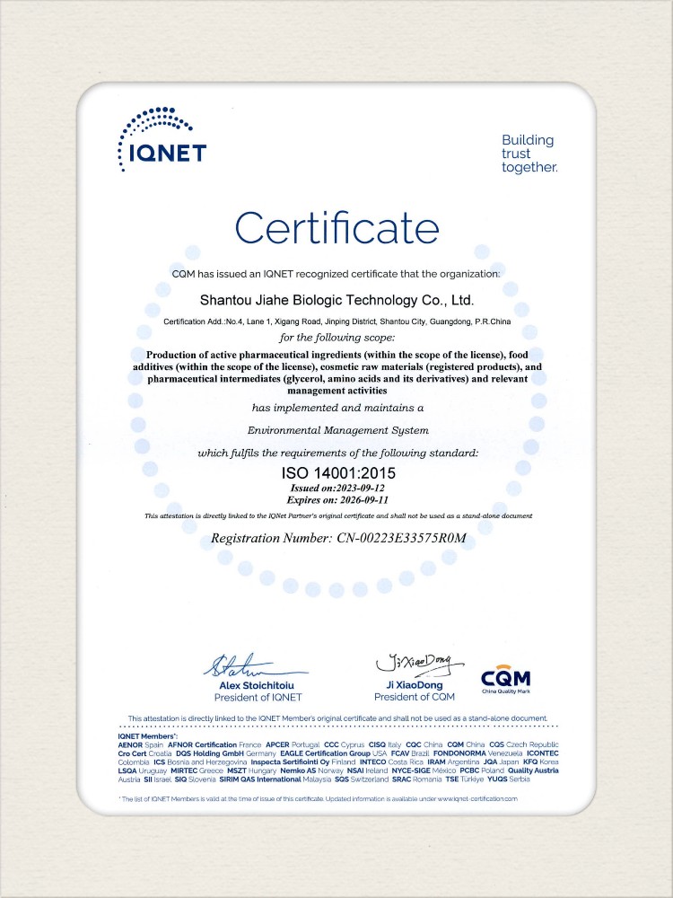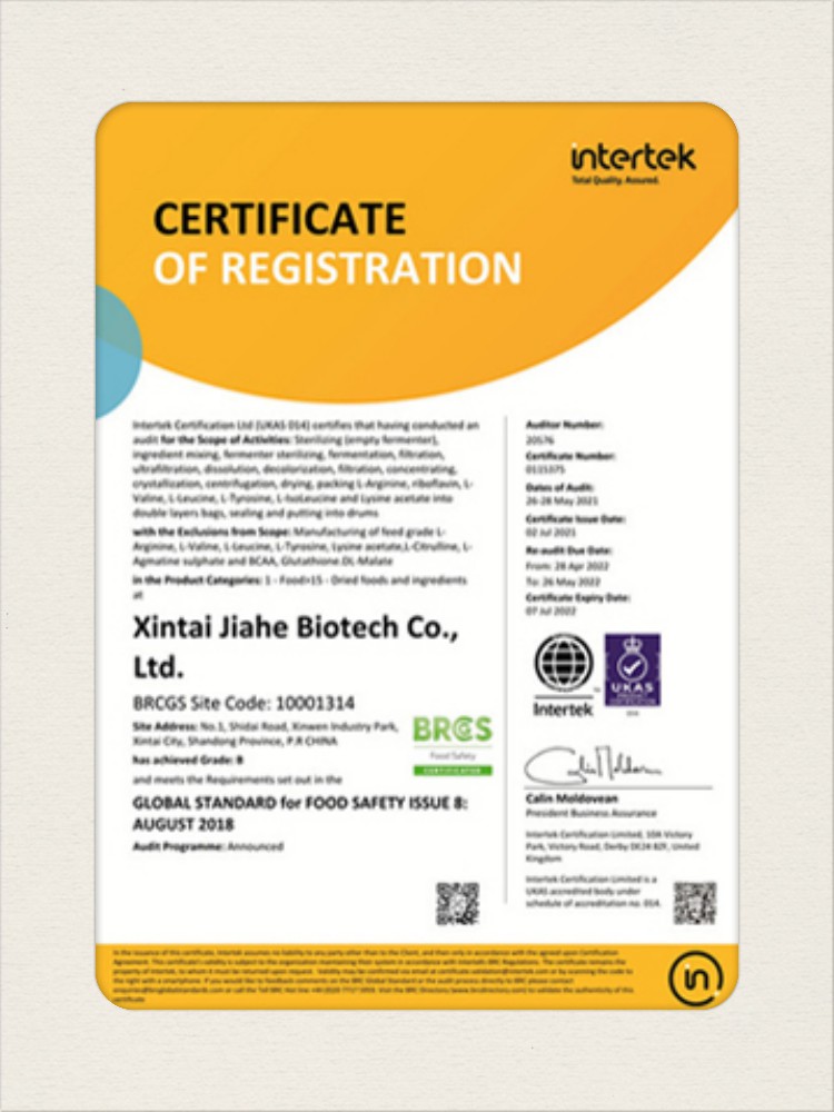 汕頭佳禾生物科技有限公司是一家致力于氨基酸及其衍生物研發(fā)、生產(chǎn)和銷(xiāo)售的國(guó)家高新技術(shù)企業(yè),先后通過(guò)了國(guó)家藥品GMP認(rèn)證,ISO9001質(zhì)量體系認(rèn)證、ISO14001環(huán)境管理體系認(rèn)證。目前,公司擁有“廣東省專精特新中小企業(yè)”、“廣東省氨基酸產(chǎn)品工程技術(shù)研究中心”、“汕頭市生物發(fā)酵工程技術(shù)研究開(kāi)發(fā)中心”、“汕頭市知識(shí)產(chǎn)權(quán)優(yōu)勢(shì)企業(yè)”、“多項(xiàng)國(guó)家發(fā)明專利”、“廣東省守合同重信用企業(yè)”等多項(xiàng)資質(zhì)和榮譽(yù),旗下“佳禾牌”系列產(chǎn)品已成為原料藥行業(yè)知名品牌。 新泰市佳禾生物科技有限公司成立于2012年8月,注冊(cè)資金2億元,公司位于山東泰安新泰市新汶工業(yè)園區(qū),是國(guó) 家級(jí)高新技術(shù)企業(yè)、山東省“專精特新”企業(yè)、山東省制造業(yè)單項(xiàng)冠軍企業(yè)、泰安市科技型中小企業(yè)、泰安市農(nóng)業(yè)產(chǎn)業(yè)化龍頭企業(yè)、中國(guó)生物發(fā)酵產(chǎn)業(yè)協(xié)會(huì)理事單位。
